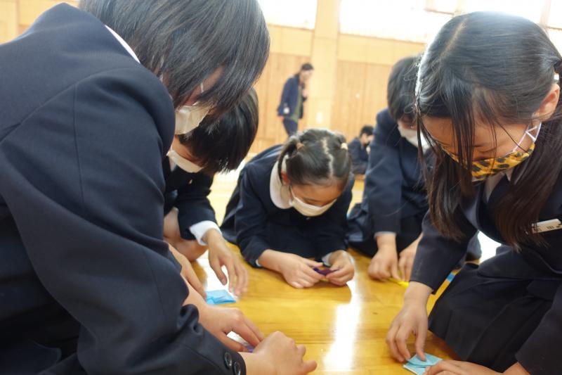 企画運営委員の児童が中心となり、高学年が低学年に丁寧に折り方を説明したり、ひとつひとつ折る動作を一緒に確認したりする姿もありました。