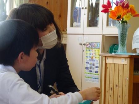 新1年生は,登校した後の朝の過ごし方を,担任とともに確認していました。
