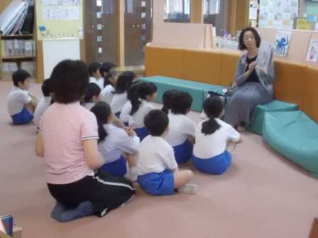 昨年度に引き続き、ボランティアグループである「ぼちぼちいこか」さんによる読み聞かせがスタートしました。この日は、1年生に絵本の読み聞かせをしてくださいました。描いた絵が本物になる魔法の筆のお話で、みんなお話の世界に浸っていました。読後の感想交流では、「みんなだったら何を描くかな?」というボランティアさんの問いかけに、「どこでもドア!」「人の役に立つ物!」などと笑顔で答えていました。今後も教職員だけではなく、ボランティアの方々による読み聞かせを取り入れ、心に栄養を注ぎたいと考えています。ぼちぼちさん、今後ともよろしくお願いします。