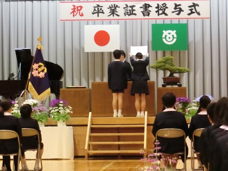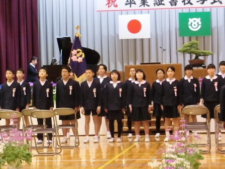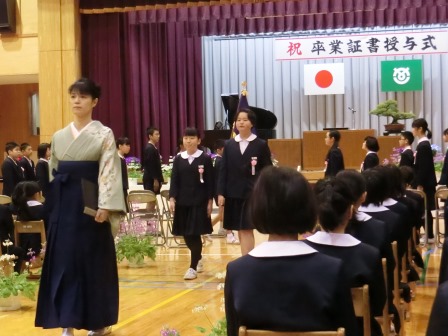 そして、お別れの「門出の言葉」。「大切な思い出がたくさんできました」、「この仲間との絆はかけがえのない宝物です」、「私たちは今 感謝の気持ちでいっぱいです」、「私たちは夢と希望をもち、新しい世界へ旅立ちます」。式場いっぱいに響き渡る卒業生の言葉からは、充実感・達成感があふれていました。また、在校生から繰り返し伝えられた「ありがとうございました」の言葉からは、学校のリーダーとして活躍しお世話になった卒業生への素直な感謝の思いが表れていました。最後に校歌を斉唱し、「蛍の光」の歌唱・合奏が流れる中、31名の卒業生が胸を張って退場していきました。