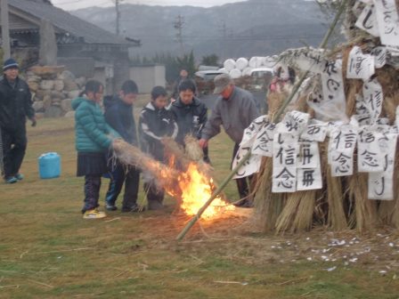 参加しました。あいさつなどが終わり、児童代表が藁で火をつけると、