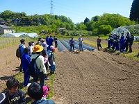 最初は、農業体験としてサツマイモの苗を約300本ほど植えました。生徒は参加者に苗を渡したり、しっかりと植えることができているかも確認しながら積極的に声掛けするなどサポートしていました。