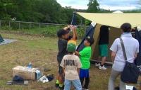 グループみんなで協力してテント張りに挑戦!   高校生もサポートして試行錯誤しながら完成!