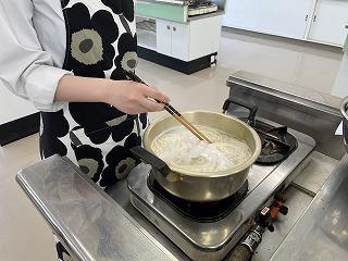 そうめんを茹でているところです 茹で上がったそうめんは手早く流水ですすいで