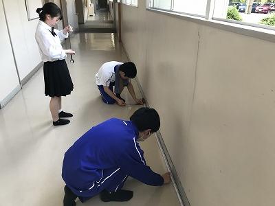 6月9日(火)トレーニングのあと、1年生結核検診の準備として、廊下にテープを貼りました。検診待ちで並ぶ生徒の目印となるものです。