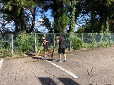 9月19日(土)8:30頃、顧問が学校に到着すると部活動前に通学路や駐車場に枯葉などがたくさん散っており、部員たちは自ら道具を取り出し清掃活動を行っていました。