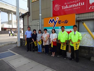 城北ライオンズクラブの皆さま、市校下婦人会の皆さま、金沢向陽高校の皆さんと、本校生徒とPTAであいさつの励行を行いました。