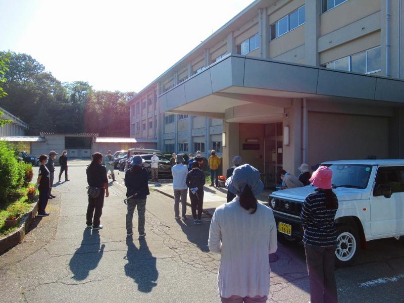朝日を浴びつつ作業打ち合わせ どの道具を使おうかな・・・ 校長もW階段を草刈り機で