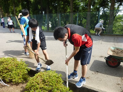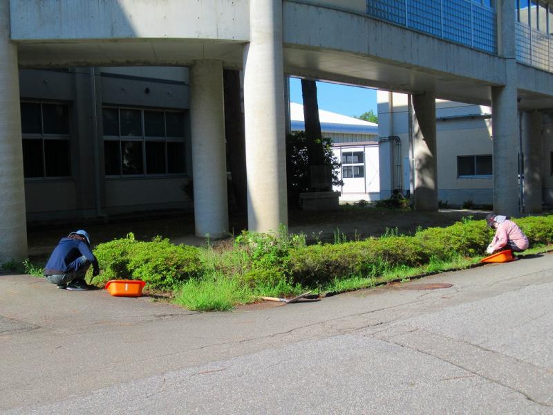 校舎前庭周辺の草刈りや・・・ グラウンド外側道路の両脇も 土上げと草刈りに精が出ます