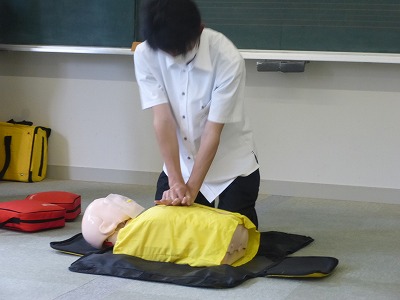 心肺蘇生法グループでは、赤十字職員の方や、他校の生徒にコツを聞きながら練習しました。