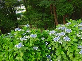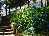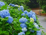 小雨の中、あじさいの青と緑が映える。S字坂にもW坂にもあじさいが多く咲き、梅雨の登下校も楽しくなる。