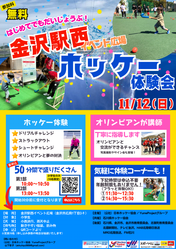 金沢市内において、ホッケー単独で募集をかけて行う体験会は初の試みとなります。