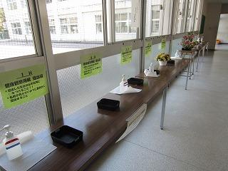 今夏の通常授業が始まった。教室前廊下には消毒液がずらりと。