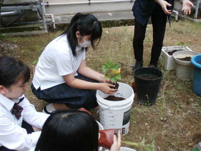 JRC部としては初の試みですが、学務員さんから「中庭にもっとお花を増やしたい」との要望を受け、あじさいを植えることにしました。花壇用のガーデニングブロックを並べ、土を盛りあじさいの苗を植えました。JRC部の先輩たちも、W坂にあじさいを植え、今のような立派なフラワーロードになっています。このあじさいも立派に育ってくれればと思います。また、金時さつまいもの苗も植えました。収穫はまだまだ先ですが、とても楽しみです。