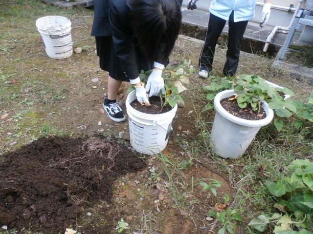 以前、プランターや植木鉢に植えたさつまいもを学務員さんに助けてもらいながら、掘ってみました。