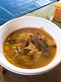 手羽元、人参、玉ねぎを10時間かけて煮込みスープが完成。味噌、えのき、しめじ、白菜、蒟蒻、鶏モモを入れて完成。