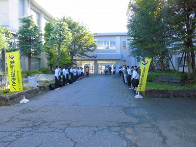 今朝はあいにくの天気となりましたが、生徒会はもちろん、女子バスケットボール部、男子バレーボール部、陸上部があいさつ運動に参加しました。11月は19日、20日,21日と開催予定です。