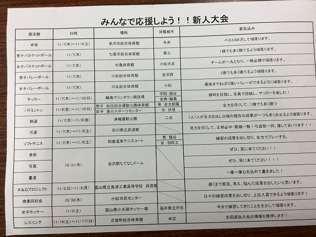 おはようございます。新人大会後期当日を迎えました。生徒会からは ”みんなで応援しよう!!新人大会” と名をうって、一覧を作成しました。ご覧になり、応援に行きましょう。