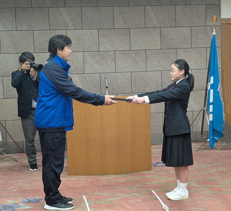表彰式では、代表生徒が県知事より表彰状を受け取りました。