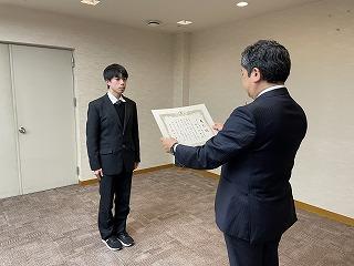 村山市長より表彰を受ける飯野くん            同じく、九野くん