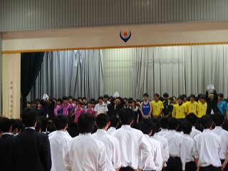 5月24日壮行式を行いました。全校生徒が一同に集まり、校歌や応援歌を歌い、総体に向けての意気込みを高めました!生徒会役員の司会進行を務め、運動部・文化部の代表が、大会に向け決意を述べました。また、永井学校長より激励の言葉を選手たちは真剣な表情で聞いていました。
