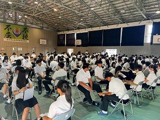 学年集会の様子。真剣に話を聞いています。