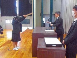 3年羽田響和さんの表彰伝達式を校長室にておこない、