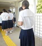 アイマスクをして点字ブロックの上を歩き、福祉実習室まで歩きました。