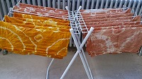 絞り染めの授業をしました。タマネギの皮と紅茶で染色しました。