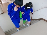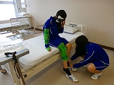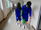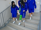 高齢になると起こる身体状況を疑似体験できる用具を装着し、歩行介助の練習をしました。