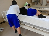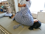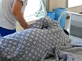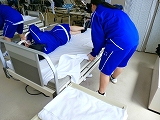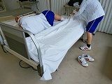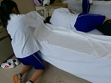 昨年の復習として、ペットメーキング(シーツ交換)の試験を行いました。