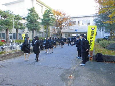 本日は悪天候の中、生徒玄関の内側であいさつ運動が行われました。生徒会に茶道・テニス部が参加しました。2学期最後は、明日、生徒会・家庭・バドミントン・美術部で行われます。