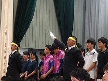 5月24日壮行式を行いました。全校生徒が一同に集まり、校歌や応援歌を歌い、総体に向けての意気込みを高めました!生徒会役員の司会進行を務め、運動部・文化部の代表が、大会に向け決意を述べました。また、永井学校長より激励の言葉を選手たちは真剣な表情で聞いていました。