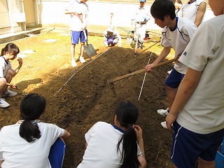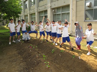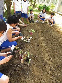 植え付けて 学務員の方に協力していただいて完成です。これから手入れをして秋の収穫が楽しみです。