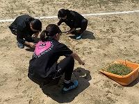 慣れない作業と蒸し暑さの中、みんな協力、役割分担をして、コート設営に取り組んでいました。