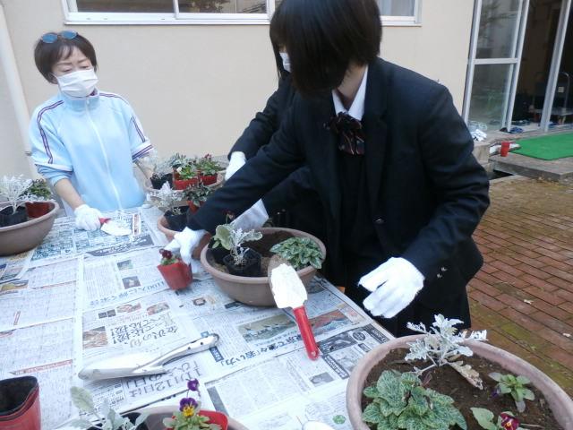 みんなで協力して植えたプランターは、職員玄関、生徒玄関などに飾ってあります。うまく咲けば、来年の5月ごろまで咲き続けるそうです。