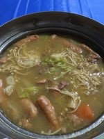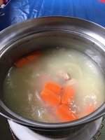 鶏ガラから出汁をとり玉ねぎ、人参を入れ煮込むとクリーム色に