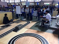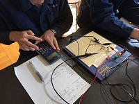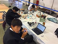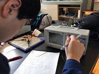 画像処理自動運転模型自動車調整 自動運転模型自動車の製作調整実演 基板製作の様子はプロジェクタで大写し