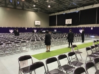 食事後は学校に戻り3年生が帰宅したところで、明日の卒業式を気持ちよく行えるよう1,2年の部員で会場の座席整頓などを行いました。
