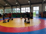 全国グレコに出場する選手はグレコローマンスタイルの練習。出場しない選手はフリースタイルの練習を行い、キルギスの選手がコーチとして技術指導を行いました。