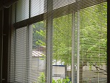 部屋から見える木。風で枝が揺れ、葉が揺れる。ブラインドを通すと涼しげさが増す。