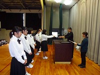 表彰披露式では、一人ひと言ずつ感想を述べてもらいました。後期生徒会役員認証式では、学校長より、ひとりひとりに任命状が手渡されました。