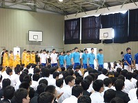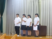 7月7日(火)に表彰伝達式と壮行式が行われた。レスリング部、女子ホッケー部、放送同好会が素晴らしい成績を残してくれた。また、全国総体に出場するレスリング部や夏の甲子園大会予選を戦う野球部、中部日本大会に出場する卓球部、県コンクールで演奏する吹奏楽部、「民家の甲子園」全国大会に出場する放送同好会には日頃の練習の成果を十分に発揮してほしいと思います。
