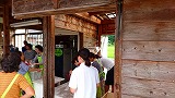 子供たちが原木に穴をあける手伝い! 生徒も穴あけにチャレンジ!