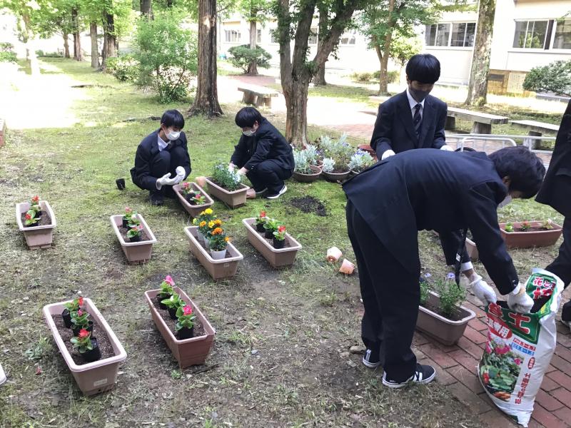 みんなで協力して植えたプランターは、職員玄関、生徒玄関などに飾ってあります。うまく咲けば、来年の5月ごろまで咲き続けるそうです。