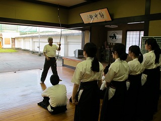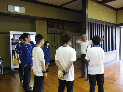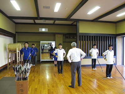 津幡町弓道協会の吉本先生の指導のもと、基礎基本からみっちり練習していただいています。新入生6名はすべて弓道初心者です。