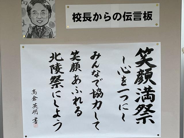 さて、本番はいよいよ明後日からの2日間です。ここまで準備してきたものをきちんとした形で残せるかどうかは、生徒全員の力にかかっていますよ。クラス、学年、そして学校全体で一体感を深めるという目的を必ず達成できるよう、思いやりの気持ちを忘れずに、当日は思う存分楽しんで交流を深めて下さい。この2日間が北陵生にとって思い出に残る大切な時間になることを心から願っています。
