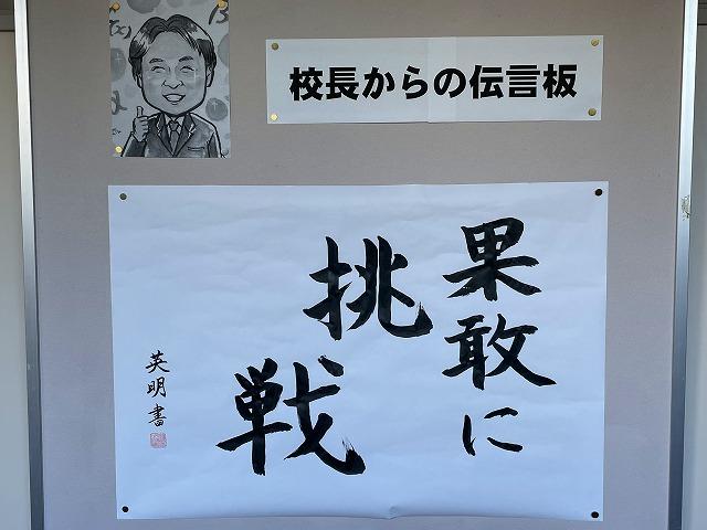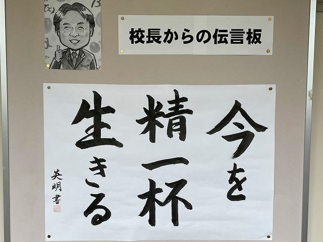 ところで、校長室前の掲示板がちょっと殺風景であったので、本日から、「校長からの伝言板」ということで、生徒の皆さんへの何らかのメッセージを発信することにしました。