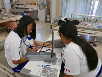水銀の血圧計を使って初めて測定してみました。なかなか脈を聴診器で聞き取ることができず何回も挑戦していました。