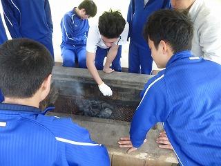 先生のヘルプも借りて、一所懸命で やったー!炭に火がつきました!さっそく